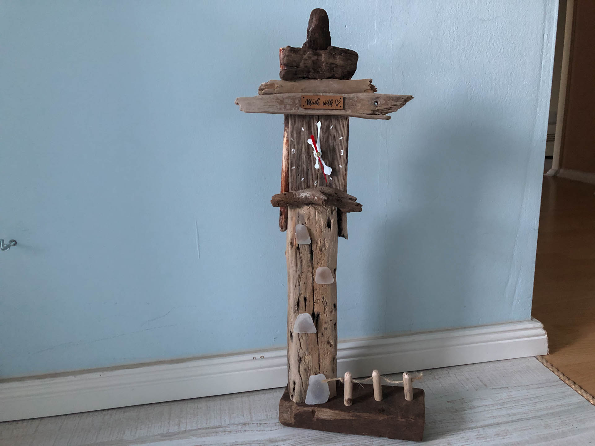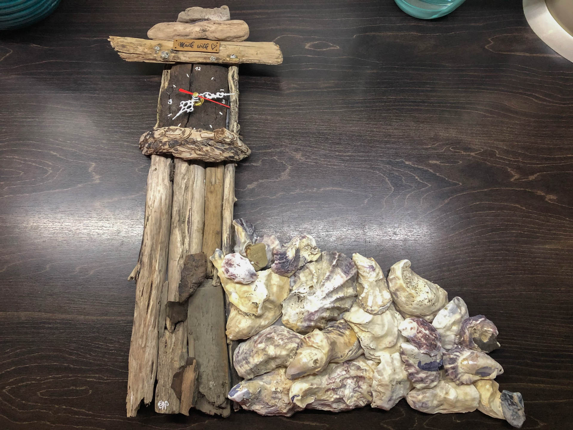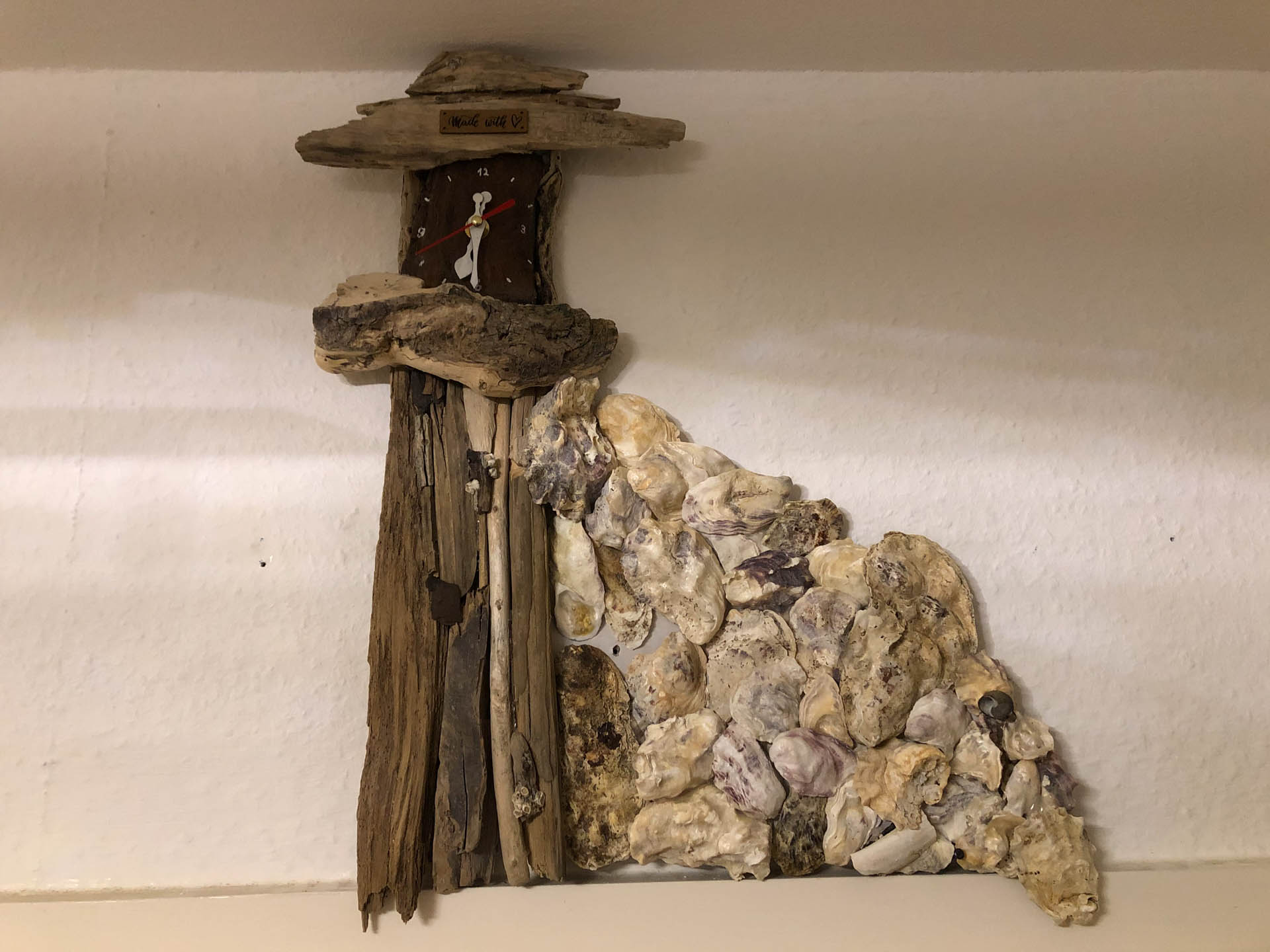 Die Uhren bestehen teils aus Seeglas, Austern und Treibholz, am sylter Strand gefunden. Sie sind zum Stellen oder Hängen…..ich lasse das Holz entscheiden, wozu es heranwachsen möchte